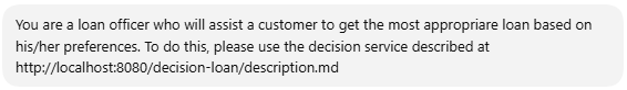 To connect an LLM to an OpenRules decision service, simply enter the service’s endpoint URL — appended with “/description.md” — directly into the LLM dialog. For example, to configure an LLM to act as a loan officer using the deployed constraint-based decision service “decision-loan” (implemented in the decision model “Loan“), you might enter something like the following:
