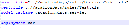 Sample Project. The sample project “VacationDaysServlet” is included into the standard OpenRules installation. It demonstrates how to deploy a business decision model as a WAR file. It builds a WAR file for the already created and tested decision model “VacationDays”. It adds the property “deployment=war” to the file “project.properties”:
