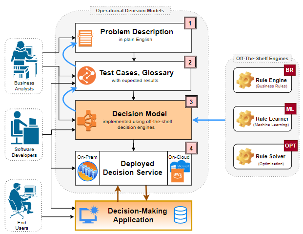 The development of operational decision services usually goes through 4 major steps presented on the picture above: