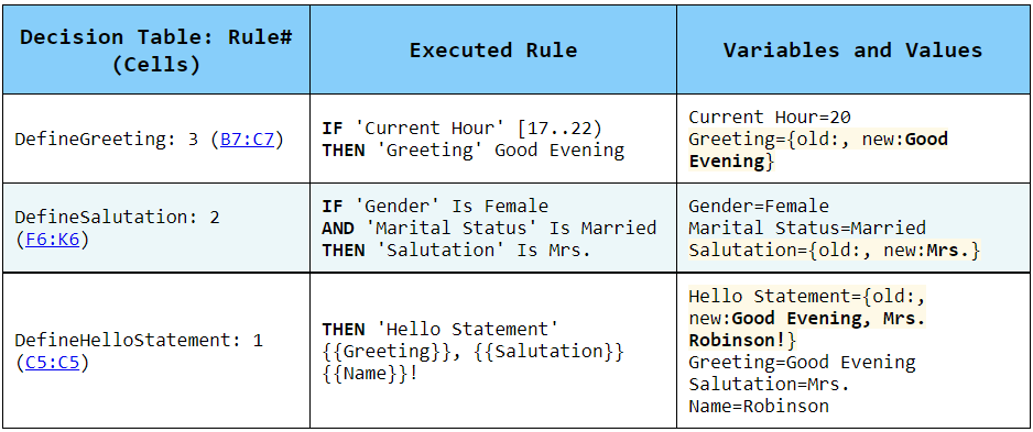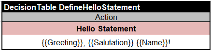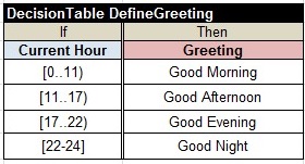 - Goal “Greeting” with possible values “Good Morning”, “Good Afternoon”, etc. that can be defined by the following decision table: