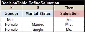 - Goal “Salutation” with possible values “Mr.”, “Ms.” And “Mrs.” that can be defined by the following decision table:
