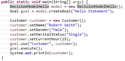 Thus, every decision model, built with OpenRules Decision Manager, includes a Java class similar to DecisionModelHello. A developer may ask this model to create an object of the type Goal for any available business goal. Then the actual object of the type Customer (that is another Java class generated based on the Datatype) should be passed to the goal using goal.use(“Customer”,customer); and then the goal maybe simply executed using goal.execute();