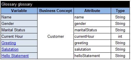 To complete our decision model we need to put all decision variables (goals and input variables used in the above tables) in one Glossary by defining their business names, business concepts they belong to, technical names (attributes for the future integration), and type: