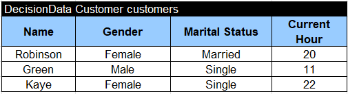 This decision model specifies how to greet a customer based on the time of the day, gender, and marital status. For example, if a customer Robinson is a married woman and current time is 14:25, we want our decision model to produce a hello statement like “Good Afternoon, Mrs. Robinson!”