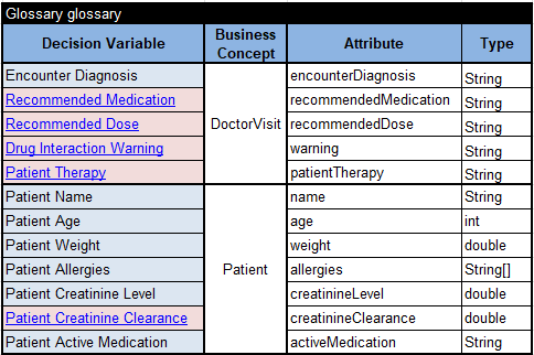 Here is its Business Glossary with two business concepts “Patient” and “DoctorVisit” with various decision variables (input variables are highlighted by blue, and output variables – by pink):