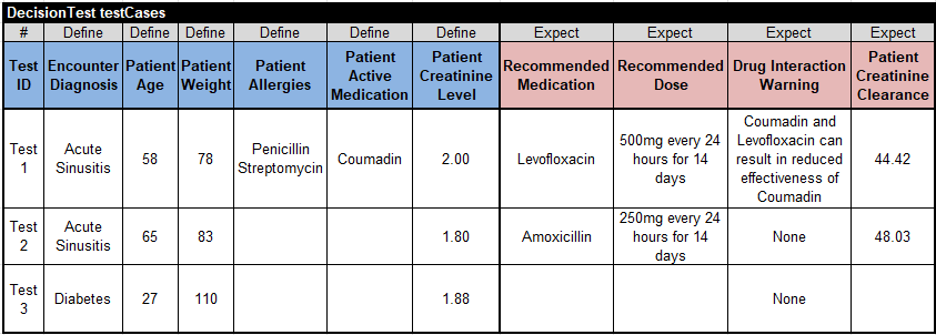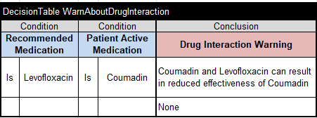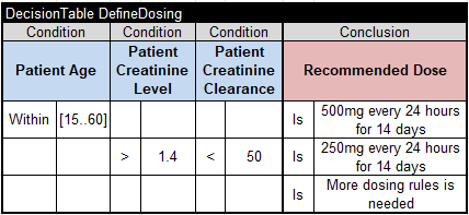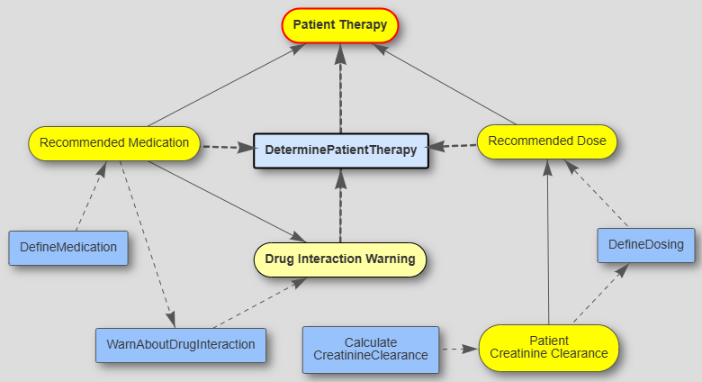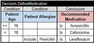 A good example of a complete decision model is “Patient Therapy“. This decision model specifies medical guidelines for helping a doctor to determine a patient therapy after the doctor encountered the patient diagnosis.