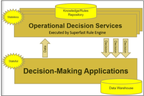 OpenRules provides a decision modeling environment for development of operational decision services for enterprise-level decision-making business applications. The top-level architecture is shown on the picture below where a stateful decision-making application invokes stateless operational decision services.