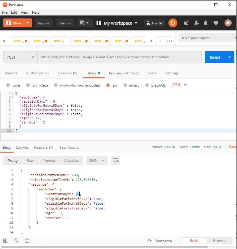 Testing with POSTMAN. You may test this decision service with the popular graphical tool POSTMAN by proving the Lambda’s URL and entering test data like in this view:
