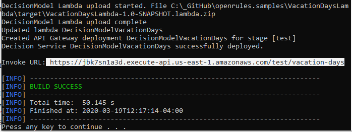 When you simply click on the standard file “deployLambda.bat“, the decision model will be deployed and the console log will show the invoke URL for the deployed decision service (highlighted in the following example):
