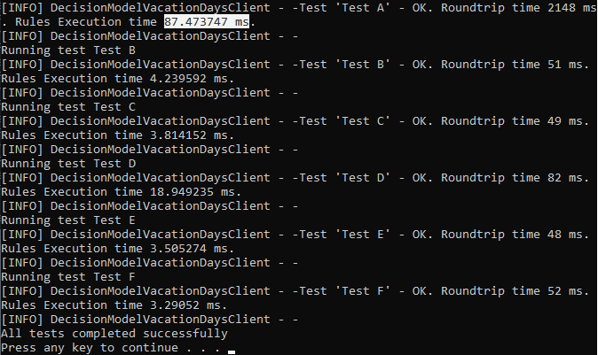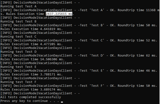 Testing Your Lambda Decision Service. To test your deployed decision service,  during “deployLambda.bat” OpenRules generated the file “testLambda.bat” that already includes the above invoke URL. When you click on this file, it remotely executes all test cases defined in the Excel file “Test.xls” against just deployed AWS Lambda. When you run “testLambda.bat” for the first time, it will show the testing results as follows: