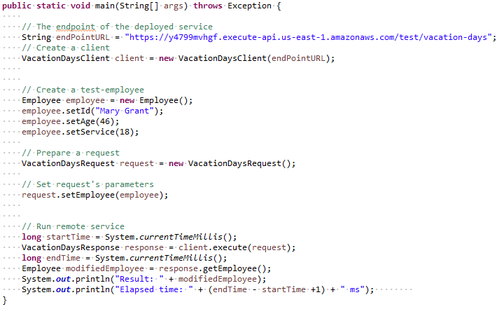 Invoking AWS Lambda from Java. The example “VacationDaysLambda” includes the Java class “SampleGeneratedClient” (in the folder “src/test/java”) that demonstrates how to invoke the deployed AWS Lambda. Here is the code: