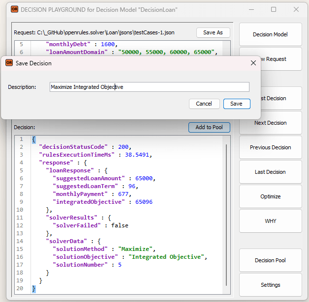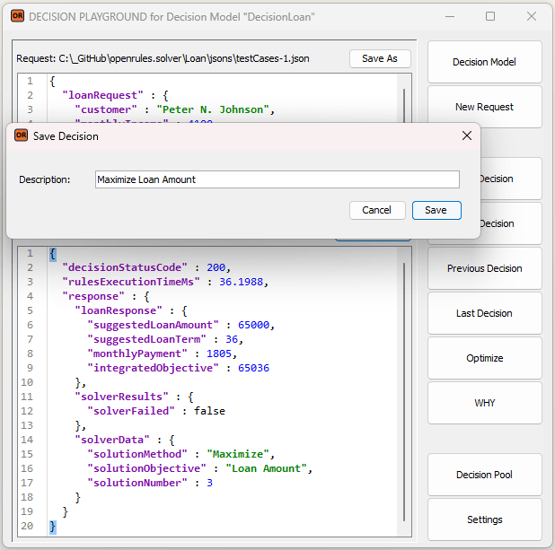 The proper decision model is implemented as a simple example, “Loan,” that comes with OpenRules Rule Solver. We will describe its implementation at the end of this page. When you click on “Loan/play.bat”, it will start the standard OpenRules Decision Playground that will be used as a self-service to help the customer choose the most appropriate loan. Here is your playground’s view after you click on the “New Request” to select a JSON file with your input data: