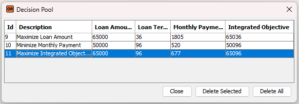This decision offers you a loan with the amount of $50,000 for 96 months, but with the smallest possible monthly payment of $520. What if you don’t mind paying a bit more per month, but to receive a larger loan amount? In this case, you may choose to maximize the Integrated Objective, which is a sum of Loan Amount and Loan Term: