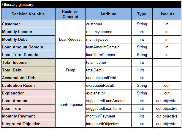 This example is based on a very simple decision model – see file “openrules.solver/Loan/rules/DecisionModelLoan.xls”. Here is the Glossary: