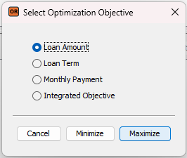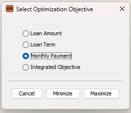 This decision offers you a loan with the amount of $65,000 for 36 months and a monthly payment of $1,803. Let’s say you decide to choose a decision that minimizes your monthly payment. Then you click again on the Optimize and make the following selection: