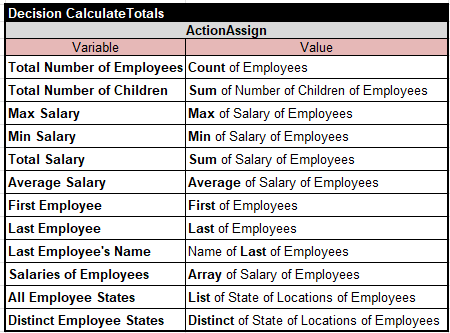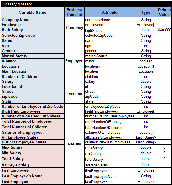 The standard installation “openrules.samples” includes the project “AnalyzeEmployeesWithoutLoops” which demonstrates the use of such functions. It is slightly different from the decision model “Iterations”. Here is its Glossary:
