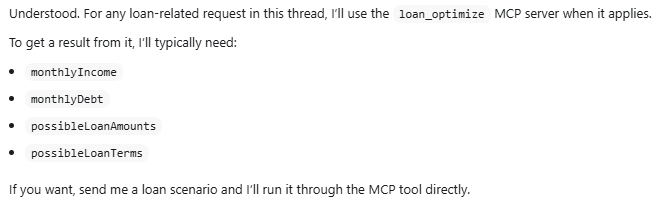“Use loan_optimize mcp server for any loan request“. Then Codex will respond: