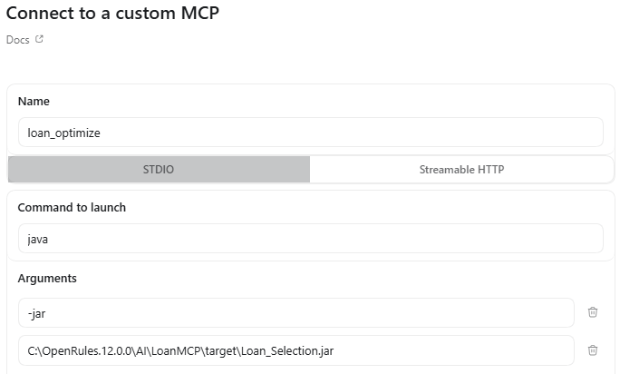 STDIO. First, package the project by running the standard “package.bat”. It will package this decision model into the file “Loan_Selection.jar” inside the folder “target”. Let’s assume that the full path to this jar-file is C:\OpenRules.12.0.0\LoanMCP\target\Loan_Selection.jar.