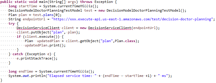 DecisionServiceClient. We added a new Java class “DecisionServiceClient” to the package “com.openrules.tools” that is now publicly available from this GitHub directory. Wherever you deploy your decision service (e.g. as AWS Lambda or a remote Tomcat), you may utilize this class to invoke your service from Java. Here is the example of a client from the standard project “DoctorPlanning” included in the Release 8.1.2: