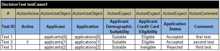 Advanced Testing Facilities. Your tables of the type “DecisionTest” now can include special (optional!) columns “ActionActive” and “ActionComment” as below:Only test-cases with active marked as “X” will be executed allowing you to concentrate on these particular tests. If all Active cells are empty, then all test will be executed.The comments include in the column “ActionComment” will be used in the test explanations when trace=On.You may split your test cases into multiple tables of the type “DecisionTest” and they all will be executed. The names of such tables should be unique.