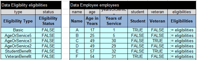 Java Snippets in Data Tables. You can use Java snippets inside Data table as below: The snippet := eligibilities in the Data table “employees” refers to the array “eligibilities” defined in another Data table.