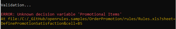 Error Validation. Release 8.4.2 comes with a new built-in compiler that runs during the BUILD phase (build.bat), so the majority of errors can be caught before code generation and reported in a much friendlier format. Now “build.bat” (or “test.bat”) validates all Excel files included in the decision model and reports all mistakes and inconsistencies by pointing exactly to the files and cells where they occurred. Here is an example of error reporting: