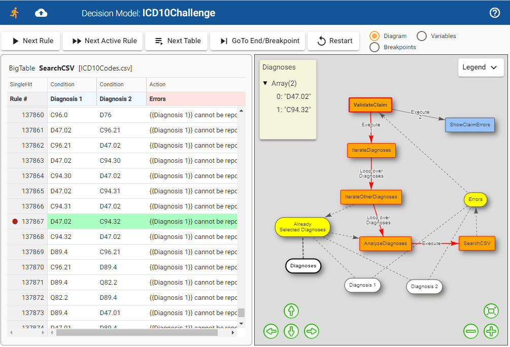 You may click on “Open Excel” to see and modify it in Excel, and all changes will be immediately reflected on the live diagram. You may set breakpoints right inside these tables. Our customers will appreciate many new graphical features of OpenRules IDE – they are described here and in this video.