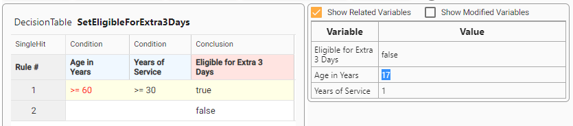 New IDE. Now OpenRules IDE shows all tables in their natural tabular format without opening the underlying Excel file. When you execute your rules one-by-one inside OpenRules Graphical Debugger, the proper table with all rules will be shown inside the left panel and the diagram on the right panel shows your current execution path and values of all selected variables: