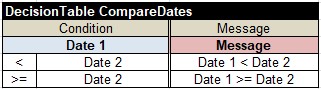 OpenRules naturally supports date comparison with the operators =, !=, >, >=, <=, and < like in the following example: