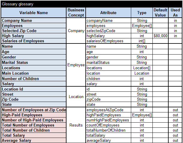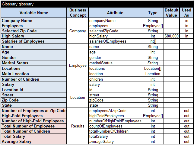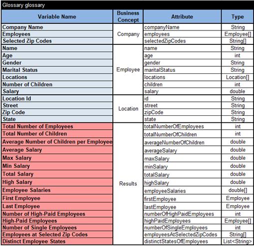 The above table is simple and defines all variables directly by using their name. However, real-world test cases could be much more complex with inter-related references. One of such examples can be found in the standard sample project “AnalyzeEmployees” that deals with a Company that has many Employees who may live in different locations. Here is the proper Glossary: