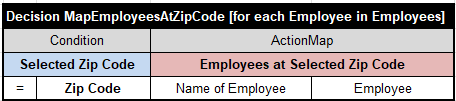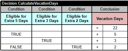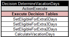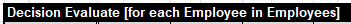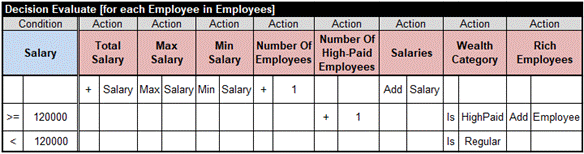 The above decision table will be executed “for each Employee in Employees” as defined in its signature row:
