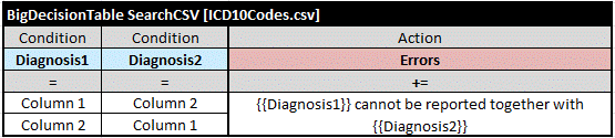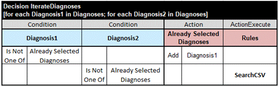 Here the first decision table “IterateDiagnoses” iterates over the array of Diagnoses for the first time using a temporary decision variable “Diagnosis 1” and for the second time using temporary decision variable “Diagnosis 2” (they are defined only within these loops). To make sure that these variables are different, it uses an intermediate array “Already Selected Diagnoses”. For each unique pair (Diagnosis1; Diagnosis2) it executes the decision table “SearchCSV” that does a highly efficient search in the CSV file “ICD10Codes.csv”.