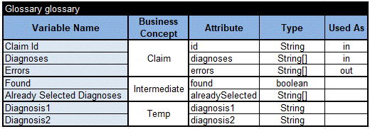 The column “Type” may even use the names of Business Concepts specified in this or other decision model glossaries or defined in 3rd party Java classes.