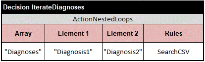 We can essentially simplify this decision model by using a special action-column “ActionNestedLoops”. Instead of the above table “IterateDiagnoses” we can use the following table: