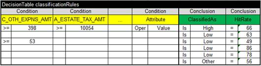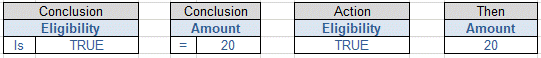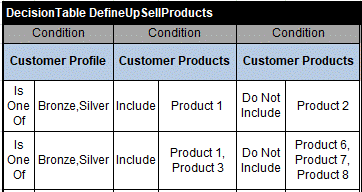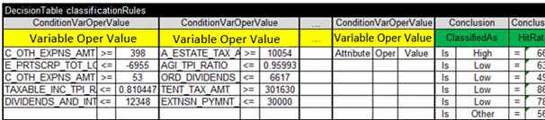The third row contains the names of decision variables expressed in plain English (spaces are allowed). The columns of a decision table define conditions and conclusions using different operators and operands appropriate to the decision variable specified in the column headings.