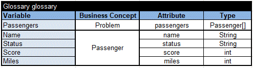 Here the array “Passengers” by itself is a decision variable defined inside the business concept “Problem”. The glossary does not include variables “Passenger1” and “Passenger2” as they are local variables used only inside the table “SortPassengers”. Their names are formed by the type “Passenger” of the array of “Passengers” plus the numbers 1 and 2.