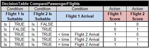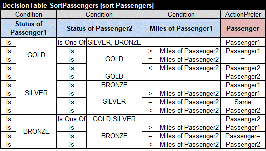 This table is taken from the standard project “SortPassengers” that shows how to sort the array of “Passengers” using their frequent flier status and a number of miles. For each pair of passengers “Passenger1” and “Passenger2” it selects a preferred passenger in the last column of the type “ActionPrefer”. When the statuses of both passengers are the same, the number of frequent miles serves as a tiebreaker. When even the miles are the same, you may use “=” or “Same” (or any other word different from Passenger1 and Passenger2). There is no need to define “Passenger1” and “Passenger2” in the glossary that simply looks as below: