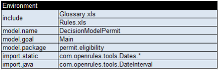 “import.static” to add references to 3rd party Java classes. For example, the standard project “PermitEligibility” uses Java methods defined in the optional OpenRules package “com.openrules.tools” included in the standard installation. So, the proper table “Environment” for this project is defined as follows: