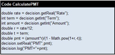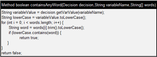 You also may define a table of the type “Method” that contains a Java snippet that returns a value. For instance, you may call the following method