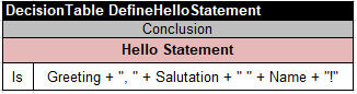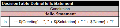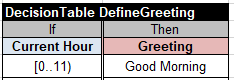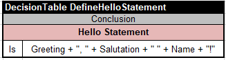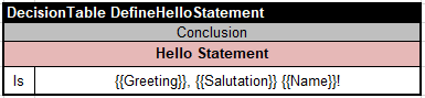 The first row after the keyword “DecisionTable” contains table name “DefineSalutation” that cannot include spaces and should be unique within the decision model. The second row uses the keywords “Condition” and “Conclusion” to specify the types of decision table columns. Instead of the keyword “Condition” you may it’s synonym “If”. Instead of the keyword “Conclusion” you may it’s synonyms “Action” or “Then”. All keywords are case-sensitive.