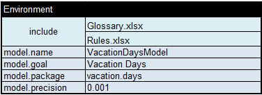 This table states that our decision model includes files “Glossary.xlsx” and “Rules.xlsx”. Your model can use multiple xls– and xlsx-files located in different folders, and you can define them all in the Environment table relative to the file “DecisionModel.xlsx”. If your entire decision model is described in one Excel file, you don’t need to define the Environment table.