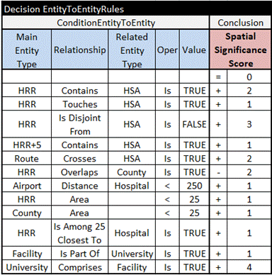 can be read as “If the distance between an airport and a hospital is less than 250 mi, then Spatial Significance Score should be increased by 1”.