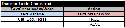 You may create a template for your own condition using a table with the keyword “TemplateCondition”. Let’s say you want to create a condition template called “TextConstainsAnyWord” and use it in the following decision table: