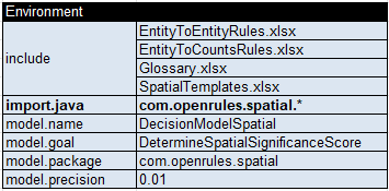 This project uses a large 3rd party library “JTS” for spatial calculations provided by Vivid Solutions. The proper dependencies were added to the file “pom.xml”. To make all these Java classes accessible from the decision model, the project uses the following Environment table: