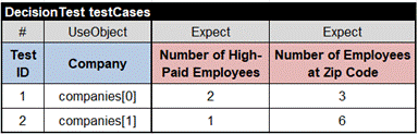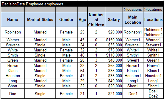 You can use special OpenRules tables of the type “DecisionData” to represent test objects for different combinations of Company, Employee, and Location.
