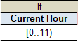 checks if the variable “Current Hour” is within the interval [0..11) assuming that 0 is included and 11 is not included.