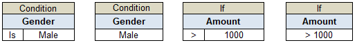 If a condition has two sub-columns it means the first one used by operators like “Is” or “>” and the second one – by values like “Male” or “1000”. Conditions without sub-columns assume that the operator is “=” or “Is”. However, you may place an operator in the front of a value in the same cell, e.g. “> 1000”. For consistency reason it is recommended to use two sub-columns.