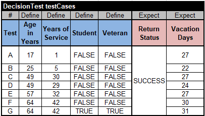This table contains blue and pink columns. The blue columns with the keyword “Define” in the second row contain input data for decision variables “Age in Years”, “Years of Service”, “Student”, and “Veteran” defined in the Glossary. The pink columns with the keyword “Expect” contain the expected results such as “Return Status” and “Vacation Days”.