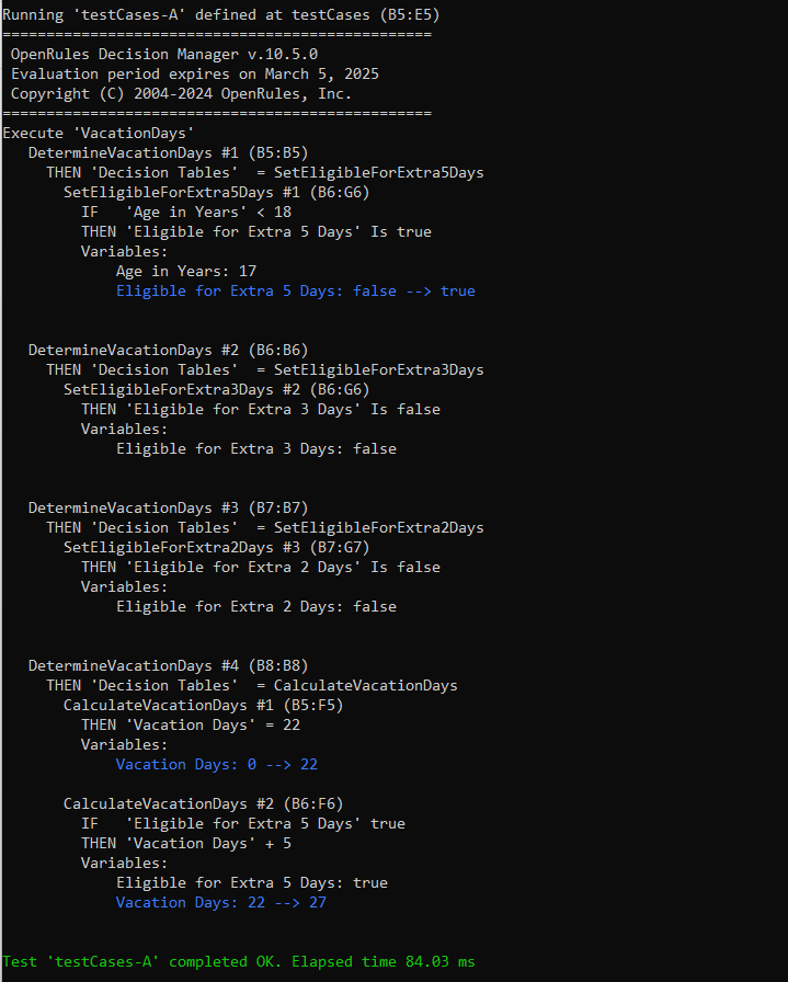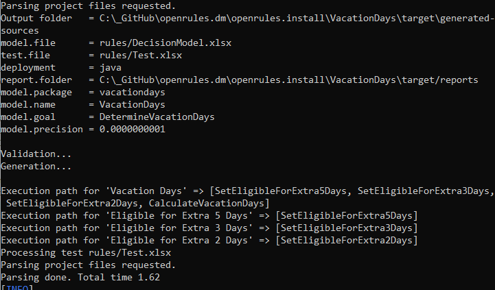 When you execute “test.bat” OpenRules validates all included files and if there are no errors it generates the correct Java code, and executes your tests. The results are shown in the execution protocol similar to this one: