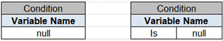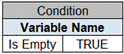| Is Empty | Applied to check if a variable of the type String, Date, or a custom type like Customer is empty. The sub-column for the value should be TRUE/Yes or FALSE/No. |